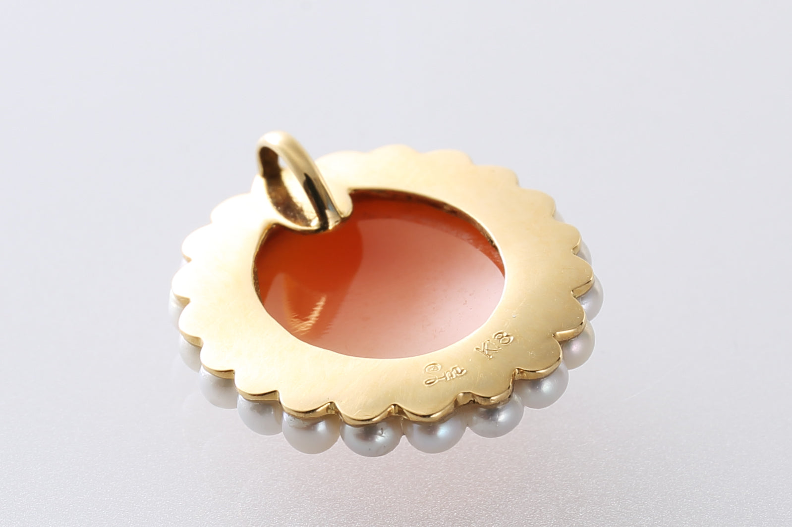 This classic and elegant pendant features a cameo of a bird holding a four-leaf clover surrounded by small freshwater pearls. This is a made-to-order item and will take approximately one month to deliver.