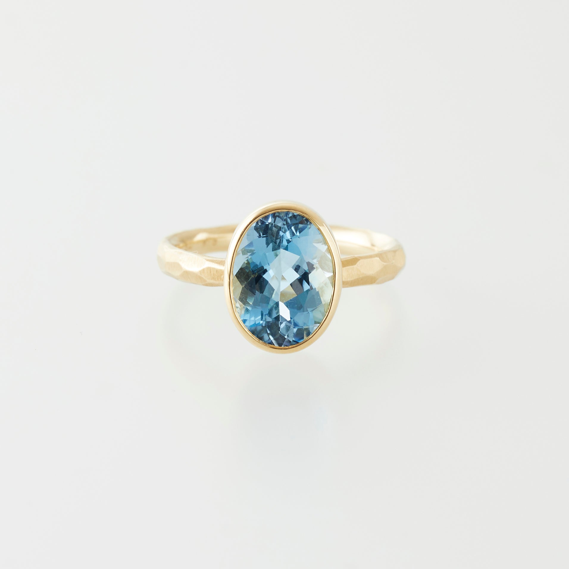 Santa Maria aquamarine is a particularly deep, rich blue aquamarine mined in the Santa Maria de Itabira mine in Brazil, and is known as the finest aquamarine. This simple ring features a hammered design on the arms.