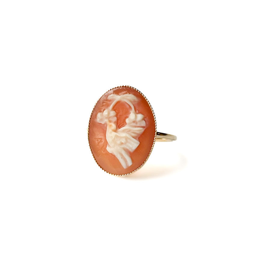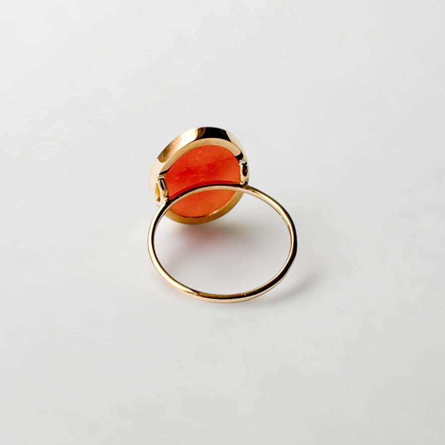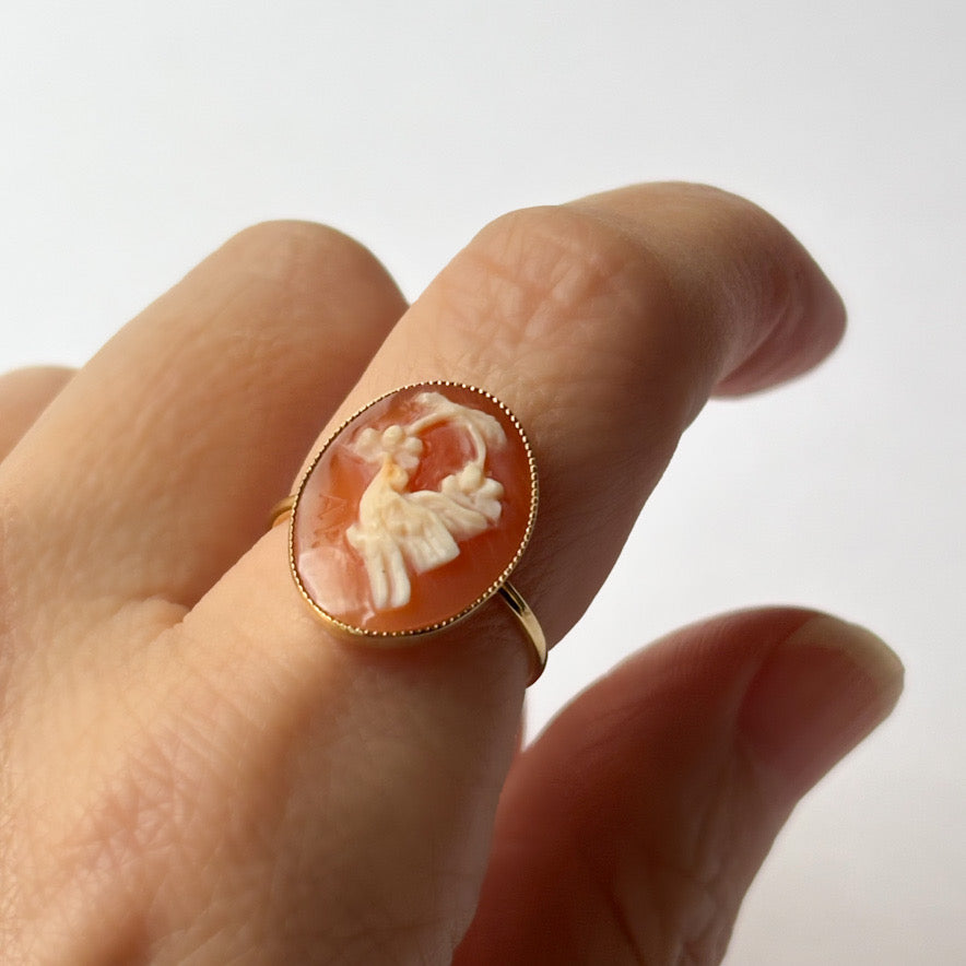 幸運と喜びを運ぶといわれるハチドリを、オレンジとアイボリー色が2層になったコーネリアンシェルに繊細な彫刻で表現したシェルカメオは以前「Comme un oiseau」(一羽の鳥のように)というタイトルで個展をしたときにデザインしたモチーフです。羽ばたきながら花の蜜を吸う躍動感に、自由と喜びを乗せて。