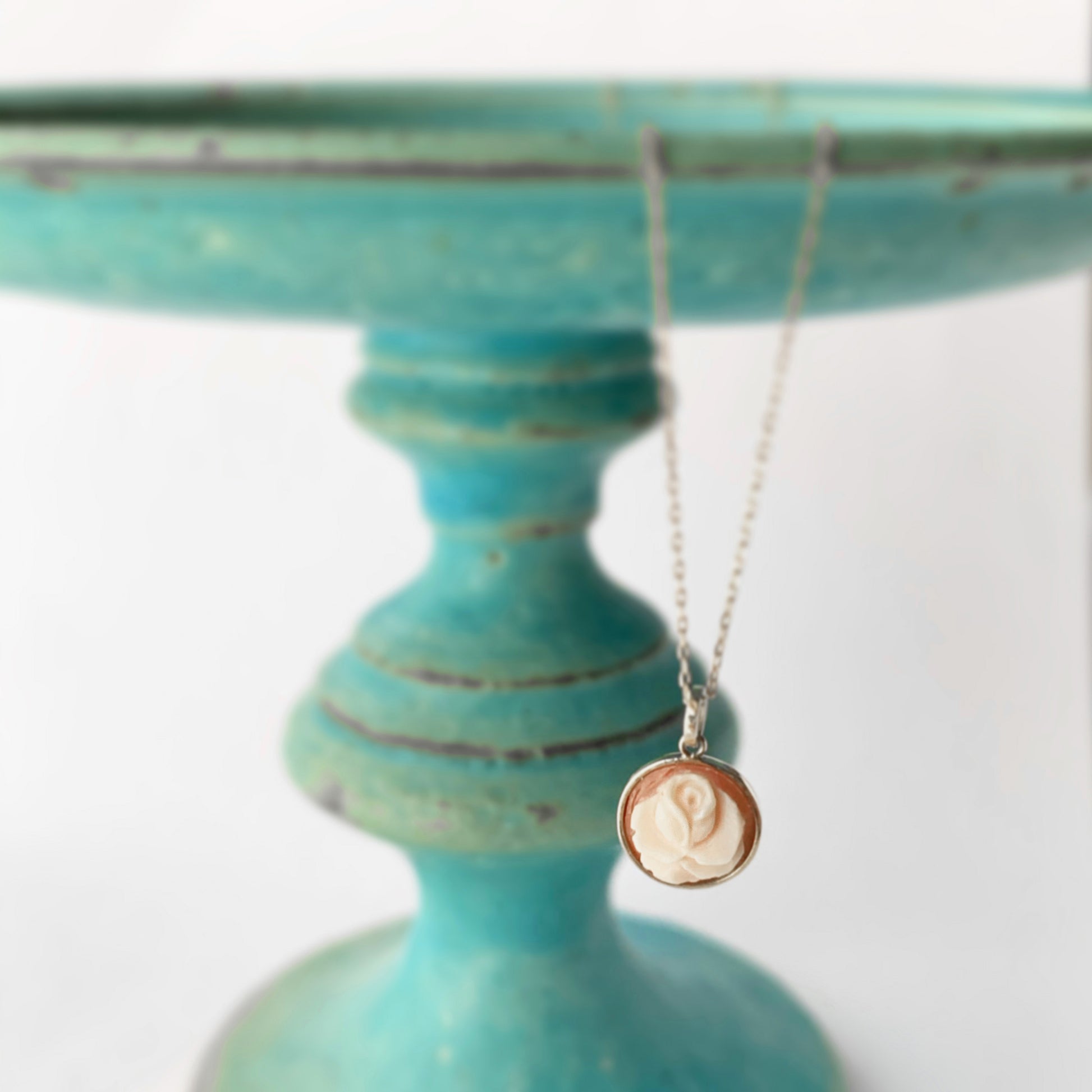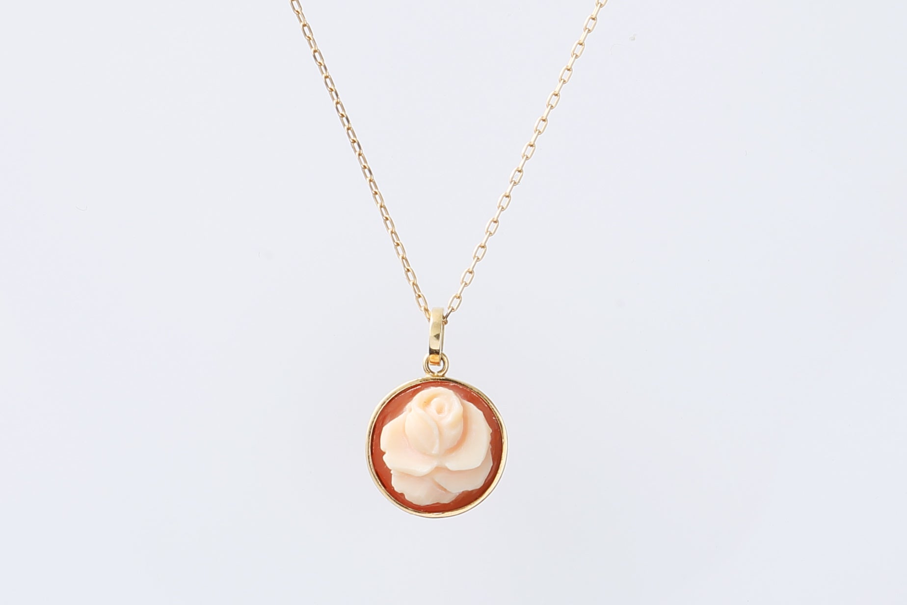 A lovely mini rose pendant made from an 8mm round cornelian shell. Comes with a 40cm chain (top cannot be removed). If out of stock, please allow approximately one month for delivery.